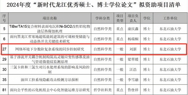 (通讯员 王美娜)近日,黑龙江省教育厅正式公示了2024年度"新时代龙江优秀硕士、博士学位论文"拟资助项目名单。经严格评审,我校7位学者脱颖而出获得资助,其中我院刘新老师的博士论文《网络环境下分数阶复杂系统的同步控制研究》成功获批自然科学类一般项目资助。